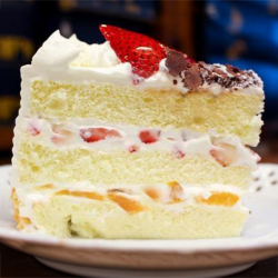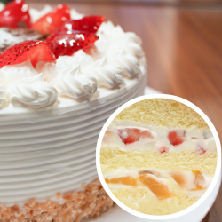 在香草戚風蛋糕中夾有一層水蜜桃、一層草莓夾餡,共譜出酸甜的美味合奏曲,給您滿心幸福的經典美味。