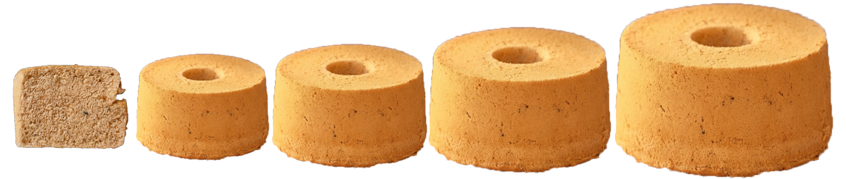 標準日式做法:將蛋黃和蛋白打到恰到好處的程度,再將兩者混合至帶有中柱的戚風蛋糕模型,在烘烤的過程中麵糊沿著模型膨脹形成蓬鬆軟嫩的口感。