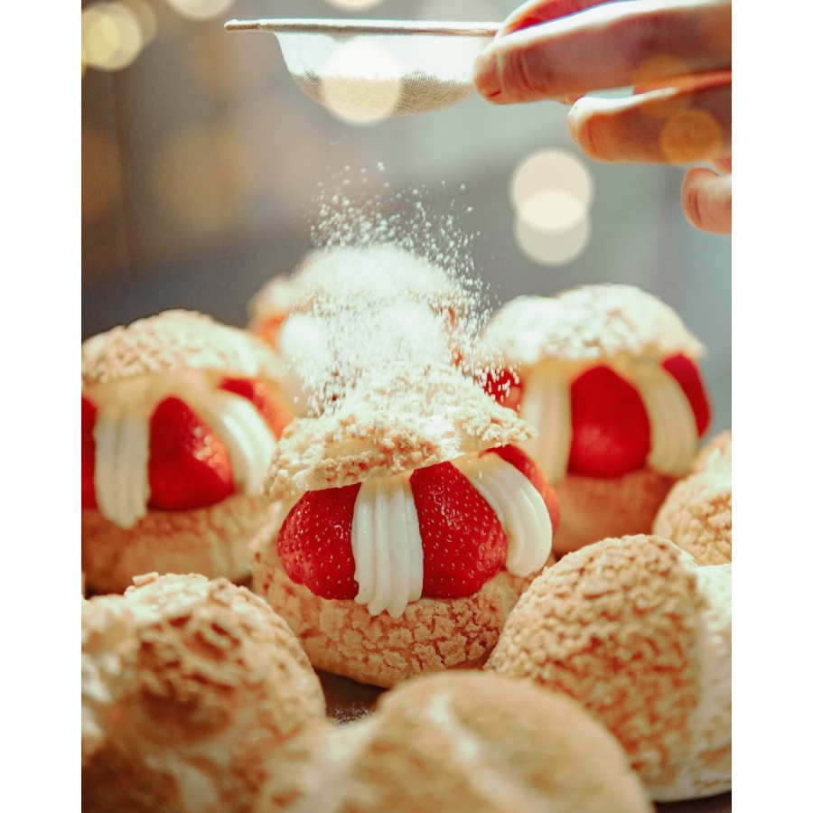 以整顆的大湖草莓,搭配手工製卡士達餡與波蘿酥皮,還有驚喜的戚風蛋糕埋藏其中,讓你一整口都是幸福的滿足。 ※預計供應時間:2024.12.01~2025.3.31 購買說明: 甜點點心沒有附上盤插或蠟燭,有需要再麻煩您加購配件~