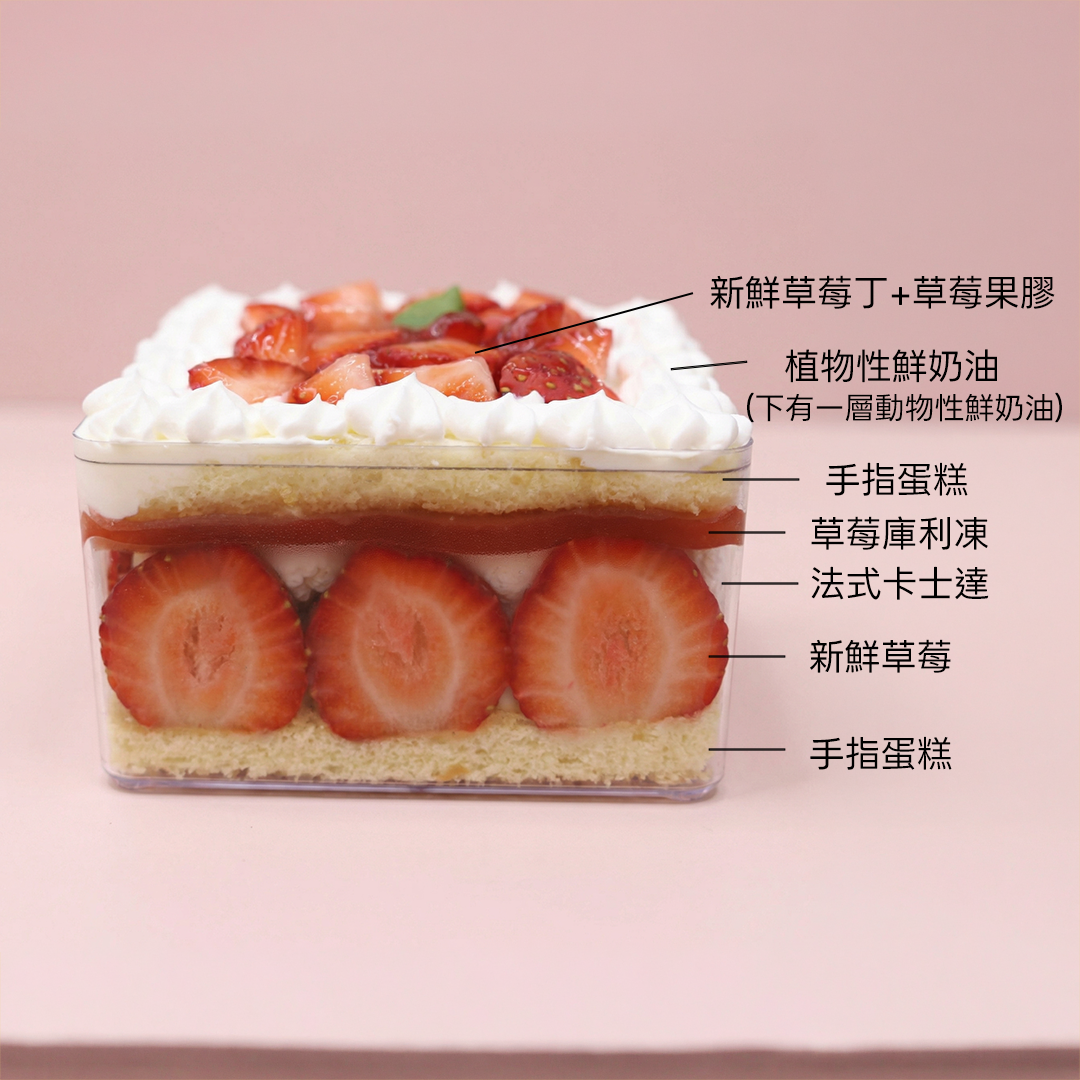 成份:低筋麵粉、鮮奶、雞蛋、 無鹽奶油、動物性鮮奶油、草莓、糖、植物性鮮奶油、玉米粉、草莓果膠、香草莢